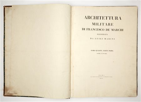2 volumi in-folio massimo, 778 x 540 mm. Mancano i primi 3 volumi di testo. I volumi in vendita sono gli ultimi 2 volumi della pubblicazione contenenti le tavole incise in rame con un formato disteso di 778x1080 mm. Nel tomo IV, tavole numerate I-XLIX, nel tomo V tavole numerate L-CIV. Sono tutte incise da Pietro Ruga e Giovanni Battista Cipriani, con date varianti dal 1805 al 1809.Legature in mezza pelle e vitello spugnato, con difetti e mancanze ai dorsi e ai piatti.Lotto non passibile di restituzione. Ad un anno dalla morte del De Marchi (1575) uscμ a Venezia dalla tipografia di Francesco Franceschi l'Architettura militare di Francesco Marchi capitano (tutti i commentatori concordano nel definirla senza data né luogo). Successive ristampe vennero eseguite per tutto il XVII e XVIII sec. circolanti anche sotto diversa paternità; a testimonianza di una crescente fortuna a fine Settecento, e per porre rimedio a una presunta carenza di copie, nel 1810 l'architetto L. Marini curò la presente ristampa del trattato, in cinque volumi in folio reale dal formato gigante, che furono naturalmente dedicati "alla Maestà di Napoleone I".