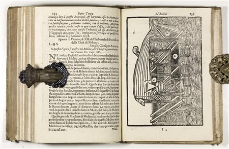 In 4° (222x160 mm). Volume I (28), 356 pp. - Volume II ° (12), 184 pp. Two Volumes bounded in one. Full coeval parchment. 5 ribs and leather gusset with title on spine. With 6 (of 7) woodcut plates folded out of the text and 44 numbered plates engraved in wood in the first volume and 39 in the second (in the text), many of them with full page illustrations. Woodcut portrait of the author on each volume. Fine example. Definitive edition, which recast together the two main works of the famous architect and military engineer Capra (c. 1610-1683), "The new Family Architecture" (Bologna, 1678) and "The new Military Architecture" (Bologna, 1683). Capra's observations on machines, from hydraulic to lifting, from mills to machines for domestic use, to reach scientific instruments such as the "baculo mensorio", the "astronomical rod" and the "compass" are particularly important. ". See Fowler, nos. 79-80. Berlin Catalog, 2752 and 3534. Riccardi, I, 234. Michel & / Michel, II, p. 38. Cicognara, 461. Millard, Italian and Spanish books. n. 27, pp. 99-102. Comolli, IV, p. 203.