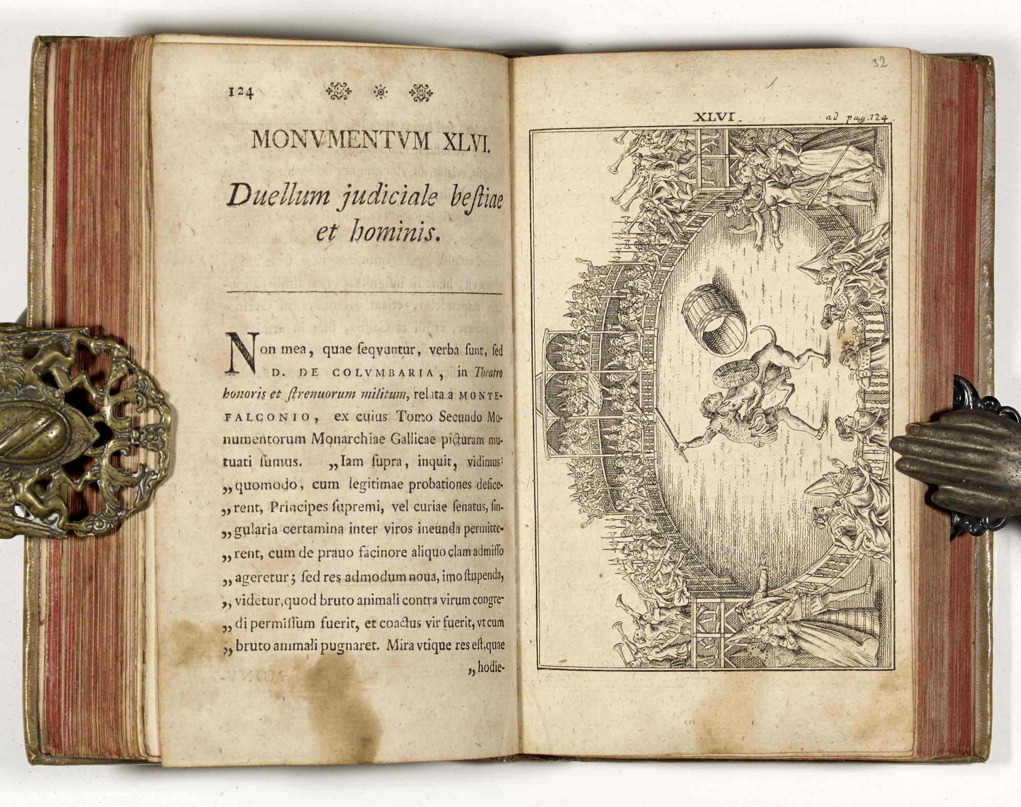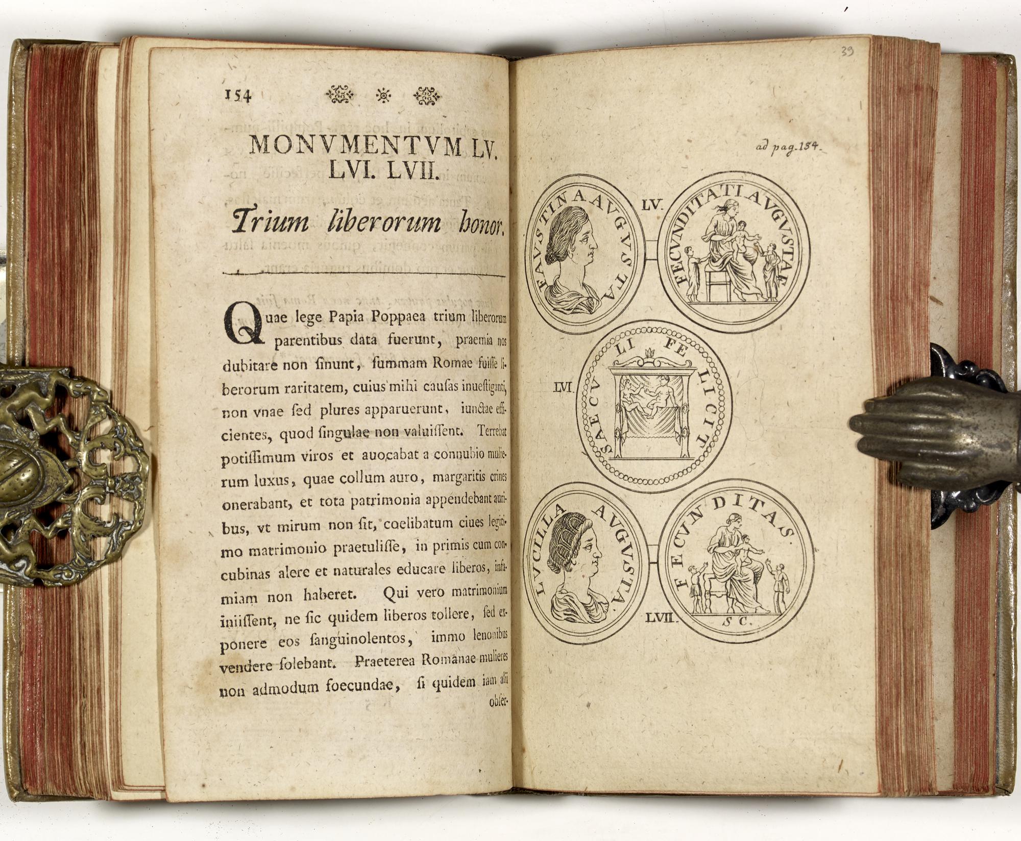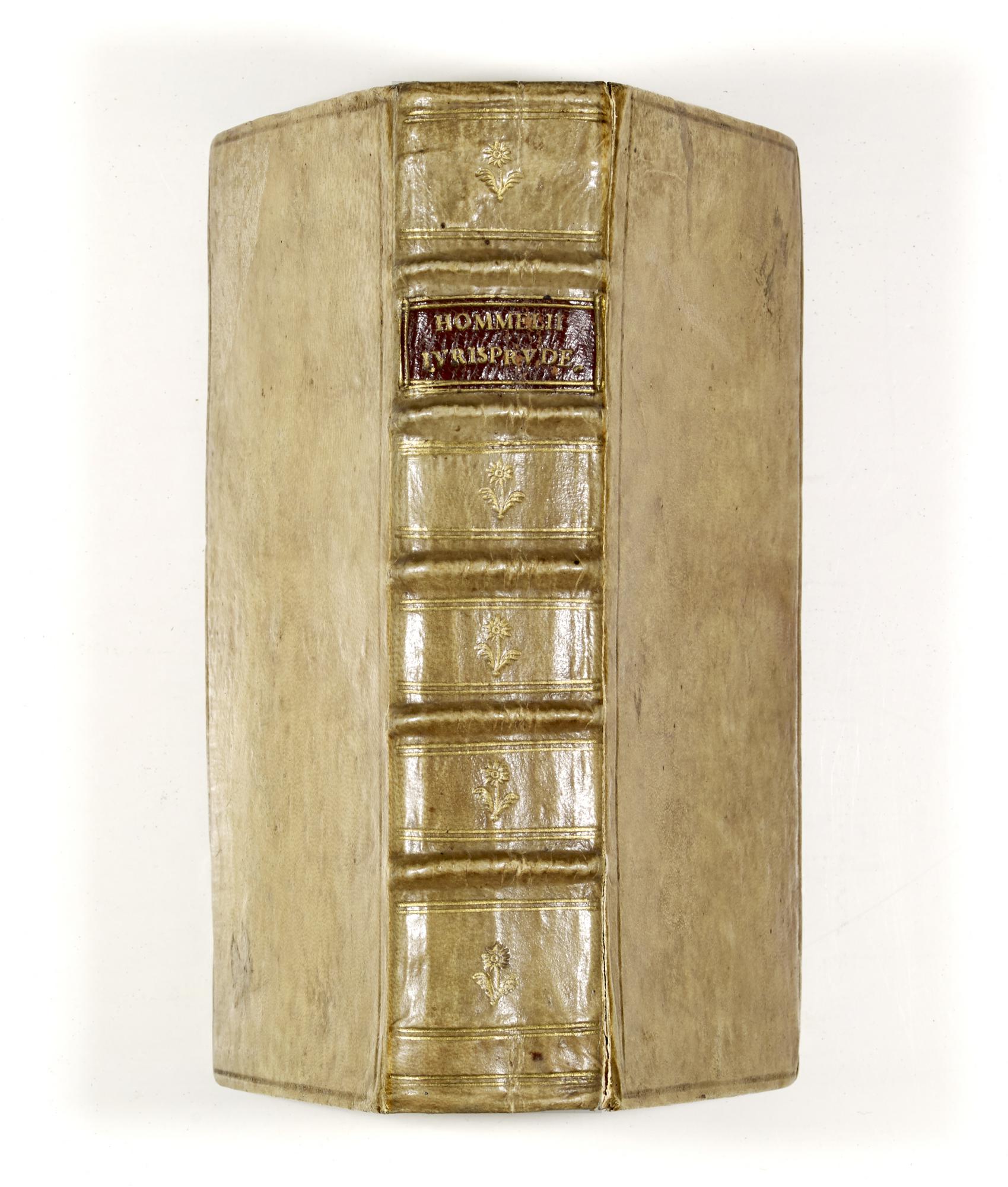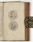In 8° (170x100 mm). XXIX, (1), 286, (16), (94) pp. Plus 71 plates. Coeval full vellum, calf lettering piece, gilt fillets and gilt ornaments on spine, edges rouged, marbled endpapers. Some toning to text, light soiling and contemporary owner manuscript signature before the title page. A handsome volume with a scarce title. Second and final edition. First published in 1753, this fascinating and well-illustrated book explore laws relating to coins and medals in Roman law, with some commentary on these topics in feudal and canon law. Topics range from weights and purity of metals to images and inscriptions. Few copies in North American libraries.