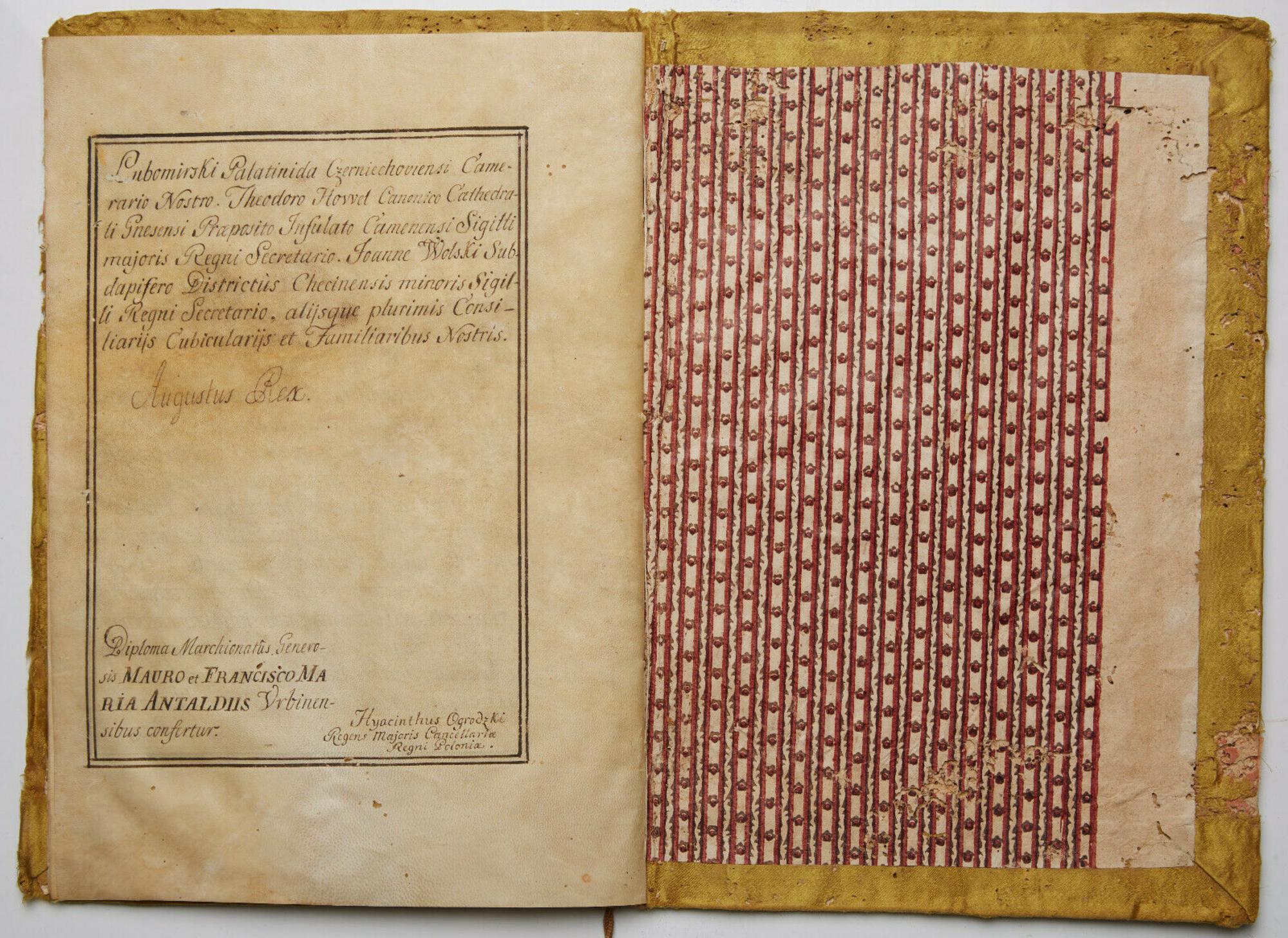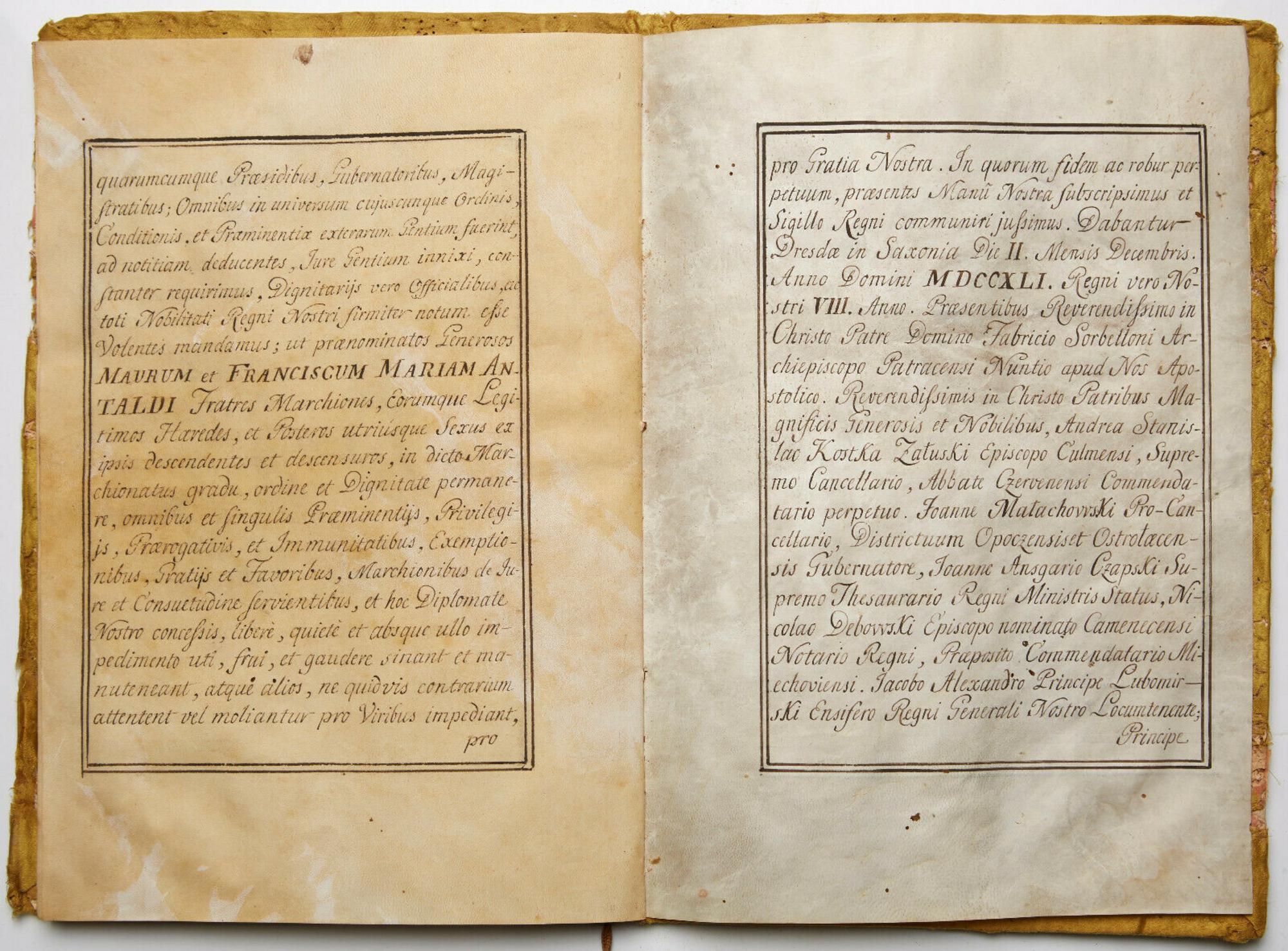 Diploma di nomina a Marchese dei nobili di Urbino Mauro e Francesco Maria Antaldi. Manoscritto a firma del Cancelliere del Re di Polonia Augusto III in data 2 dicembre 1741 dal palazzo di Dresda.