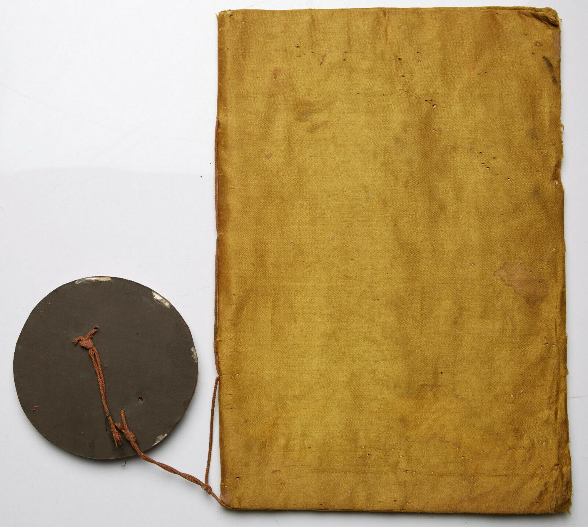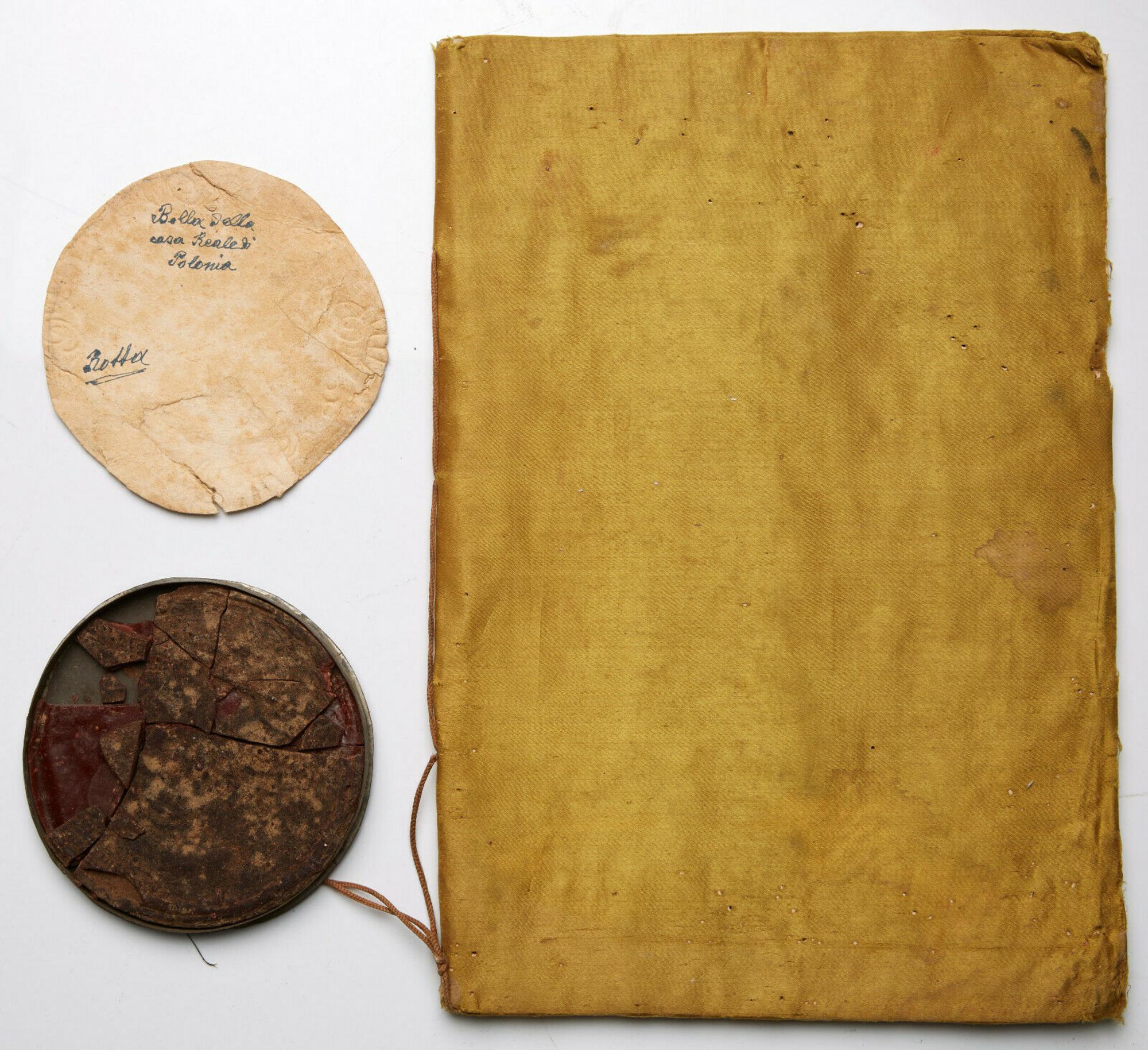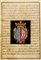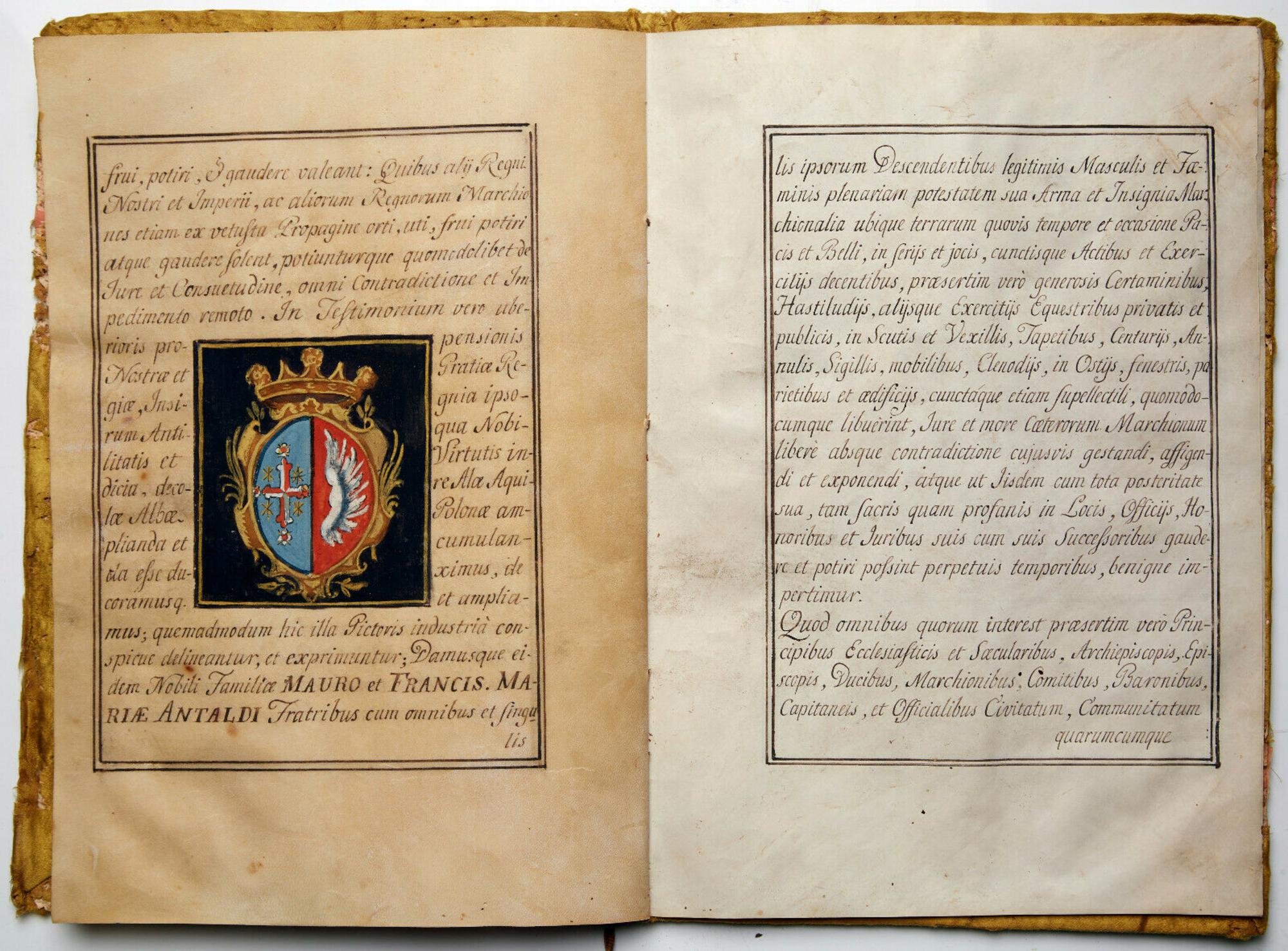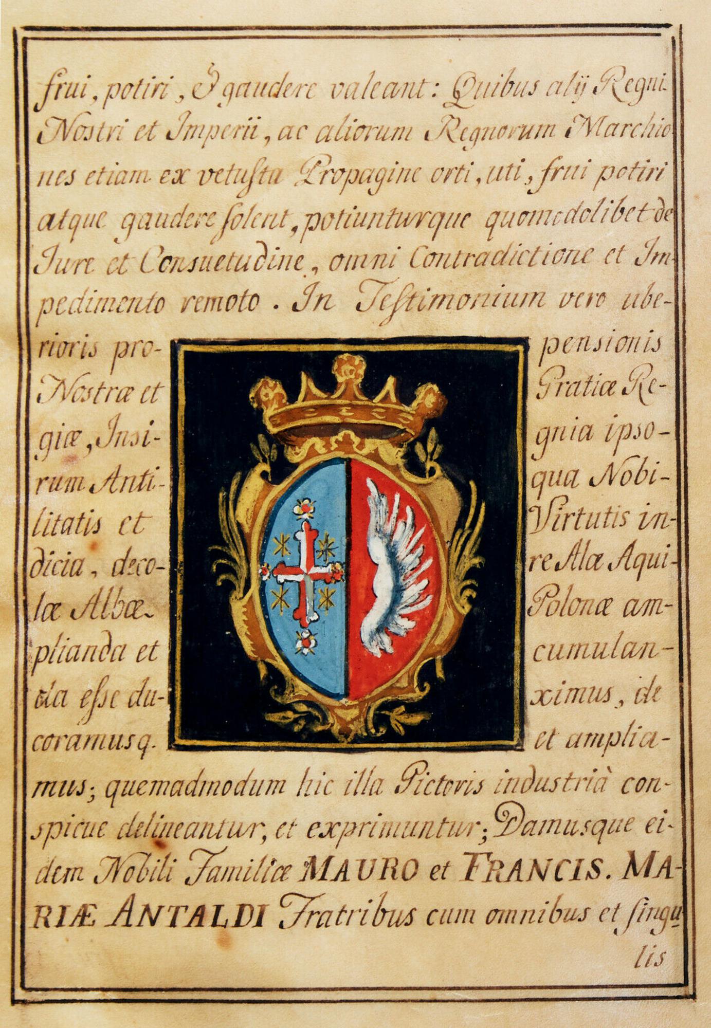 In folio (360x250 mm). Manuscript of 5 ff on parchment, boxed text, on the reverse of the paper 3 an illuminated coat of arms of the Antaldi's. Contemporary binding in yellow silk, endpapers in decorated paper. Royal seal in metal box, with missing parts, without lid.