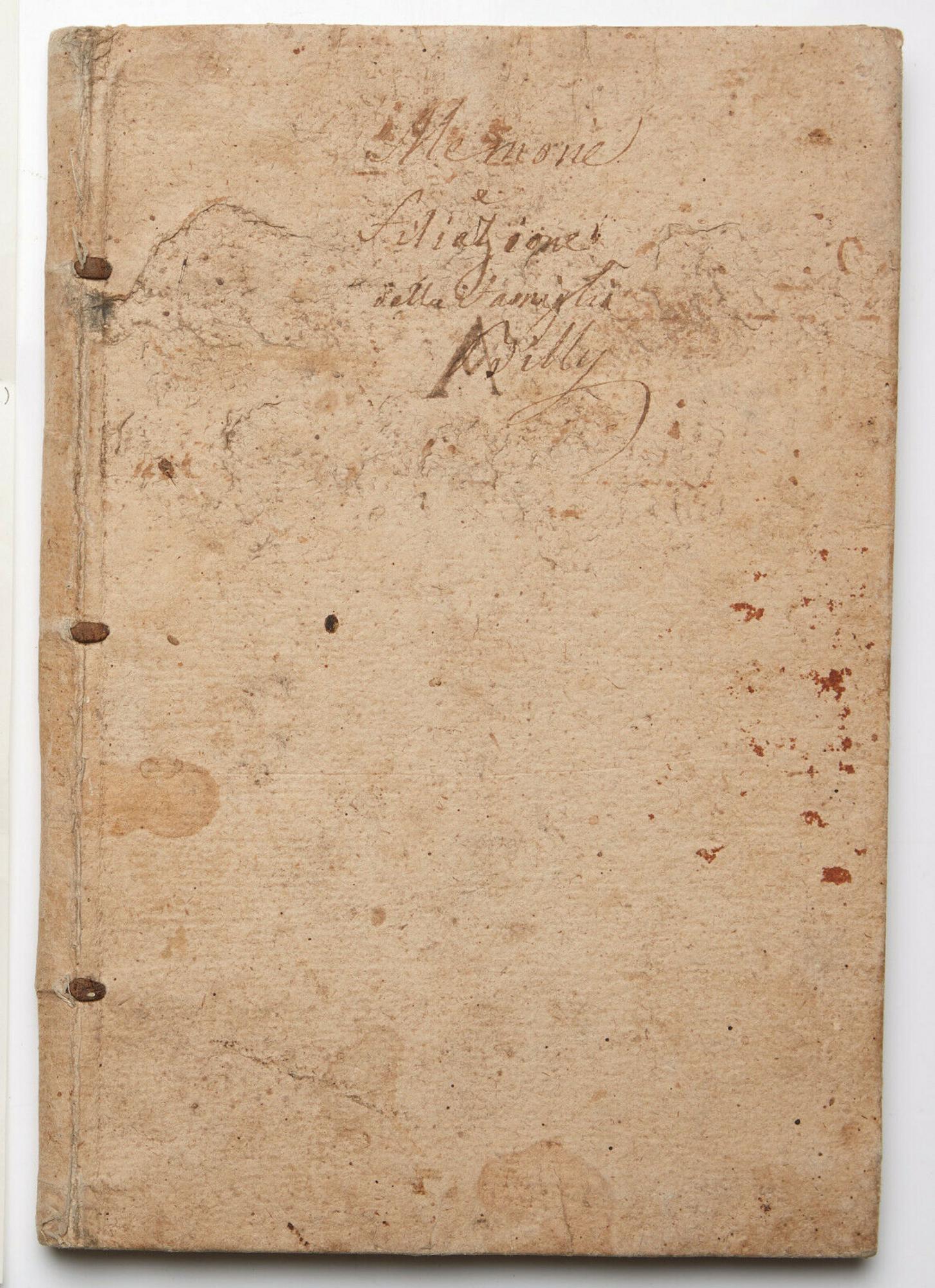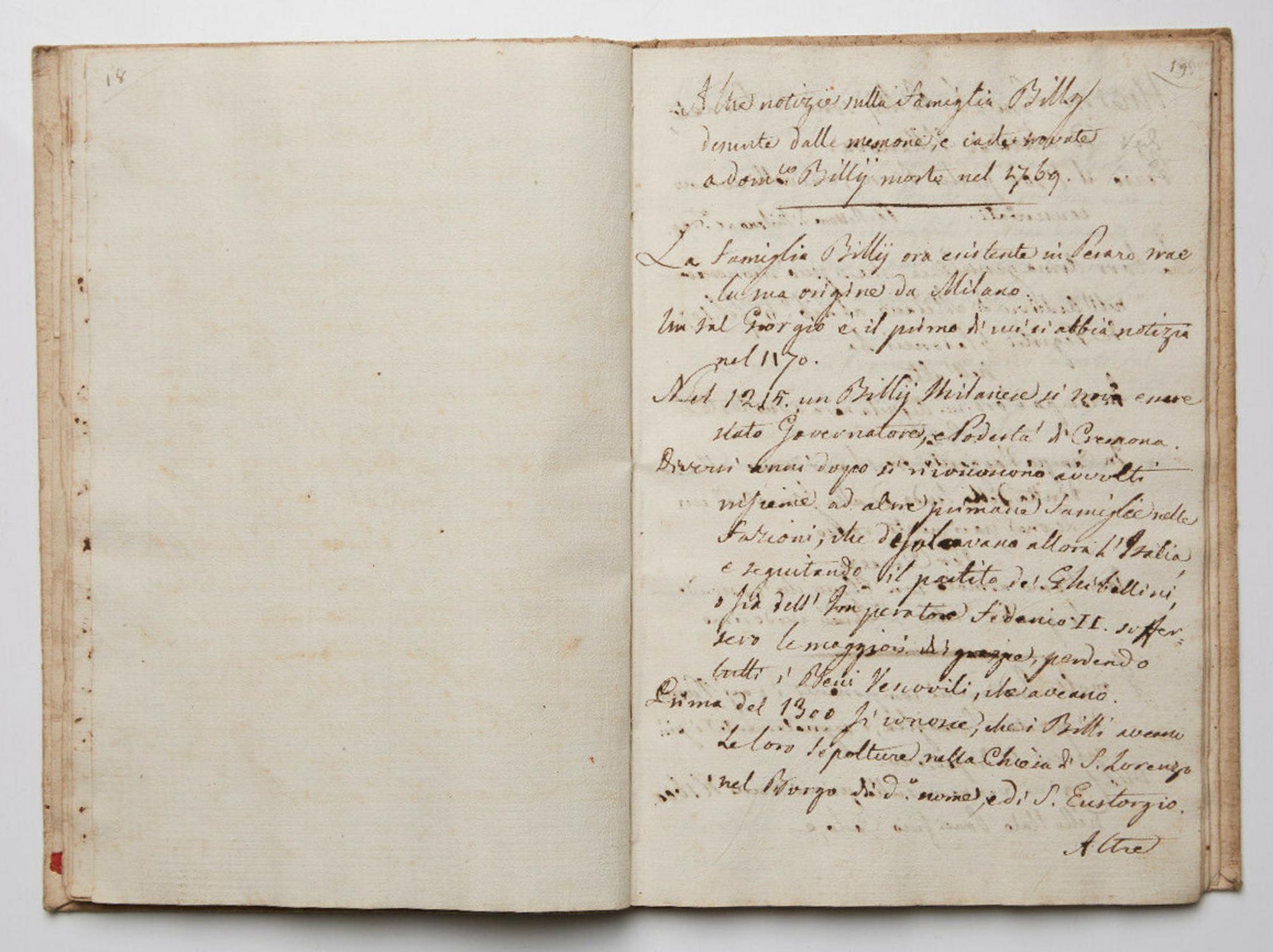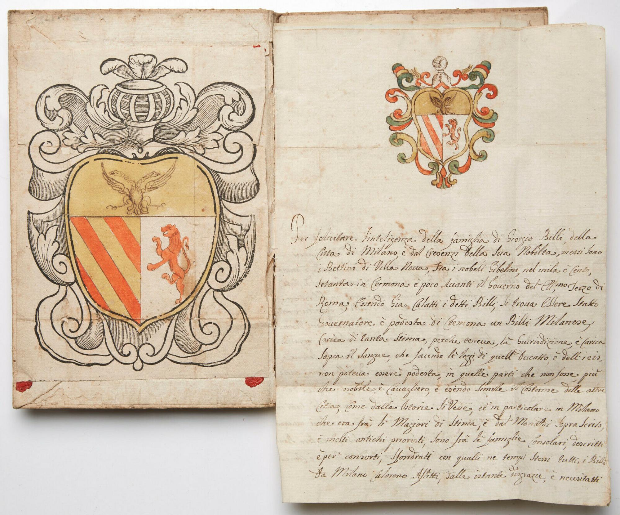 In-4° (mm 260x175) Legatura cartonata coeva con il titolo manoscritto sul piatto anteriore. Grande arma familiare acquerellata a colori con i simboli della famiglia Billy su "crest" xilografico con elmo di armatura da Cavaliere incisa su un foglio a parte e incollata sul verso del piatto anteriore. Arma della famiglia Billy in testa al primo foglio del manoscritto disegnata a penna e acquerellata a colori.