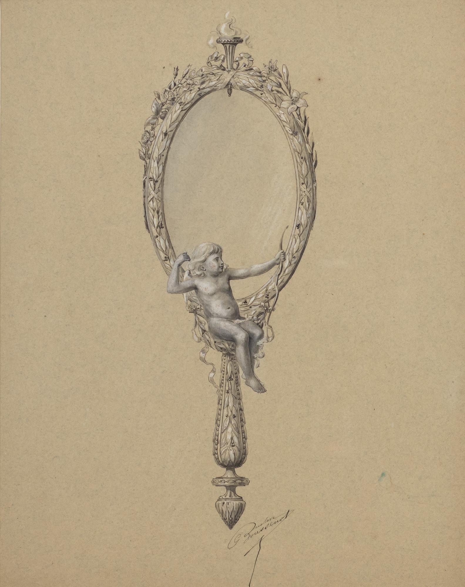 Specchio con putto, inchiostro e tempera su carta, cm 30x39, firmato