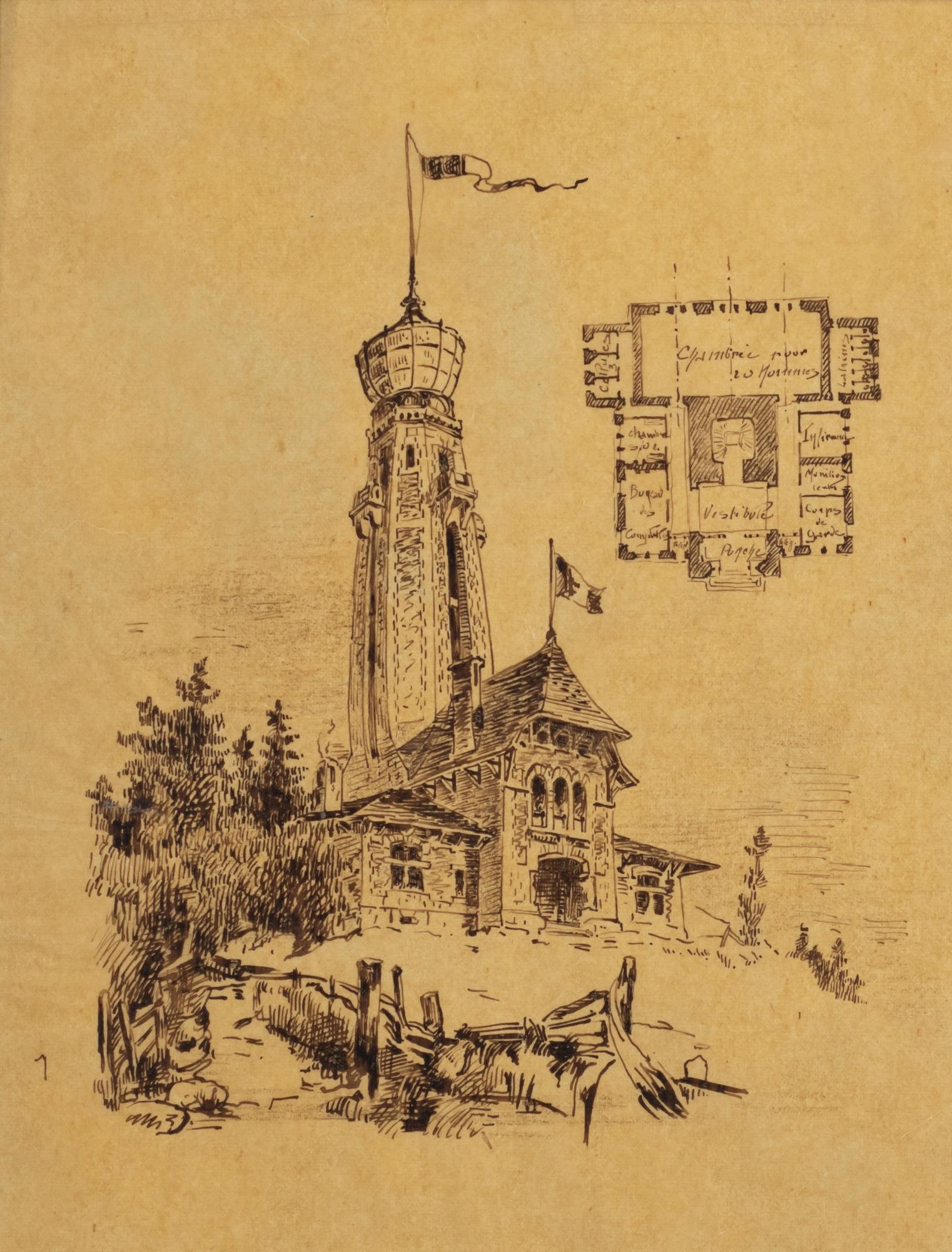 Veduta di castello, inchiostro su carta, cm 20x26, firmato