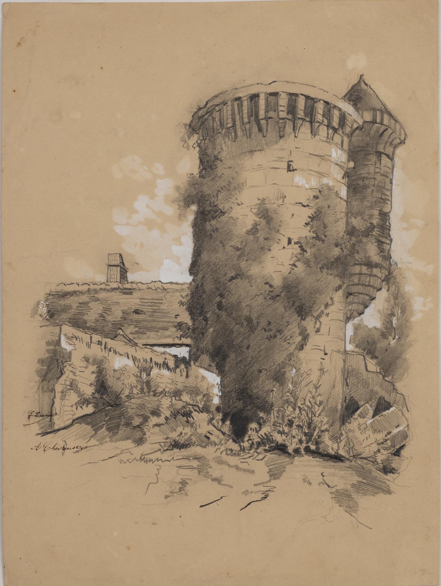 Veduta di castello, grafite e biacca su carta, cm 24x32