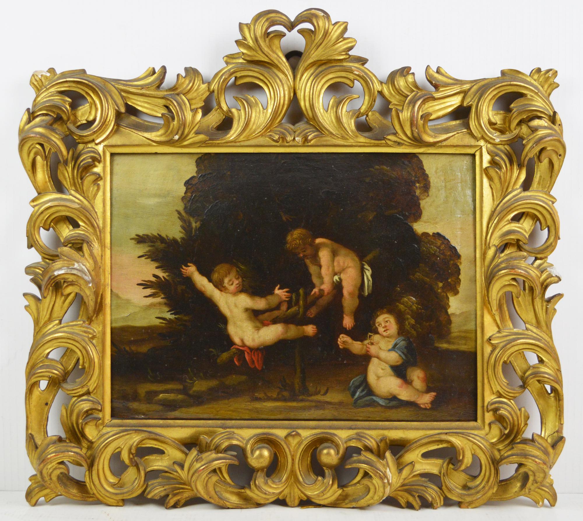 Scuola Emiliana del XVII secolo FANCIULLI AL GIOCO olio su tavola, cm 24,5x33...