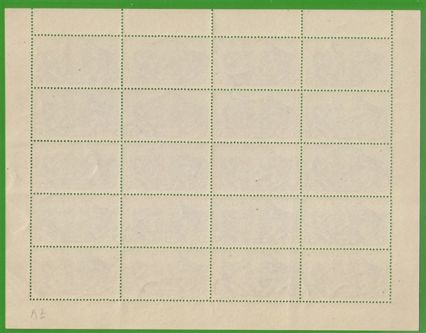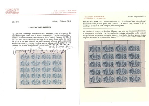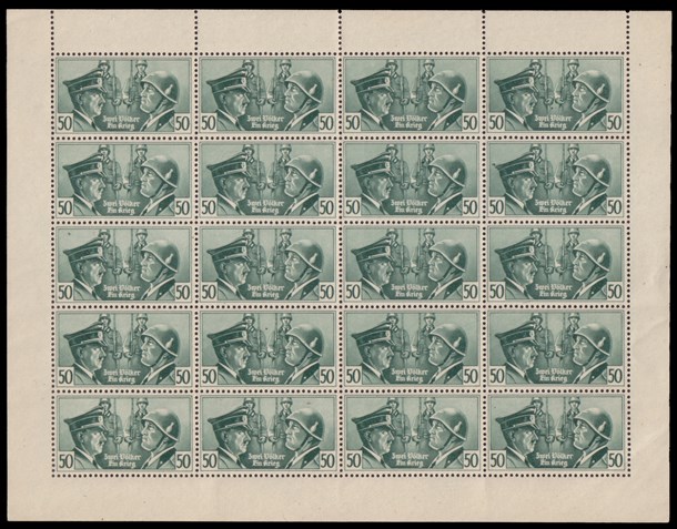 Imitazioni di Guerra "Fratellanza d'armi italo-tedesca". Foglio completo di 20 esemplari del 50c. verde, carta grigia
