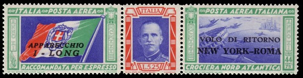 Posta aerea "Crociera del Decennale". Trittico 5,25+44,75 lire, non emesso, soprastampato "VOLO DI RITORNO / NEW YORK-ROMA", sigla I-LONG