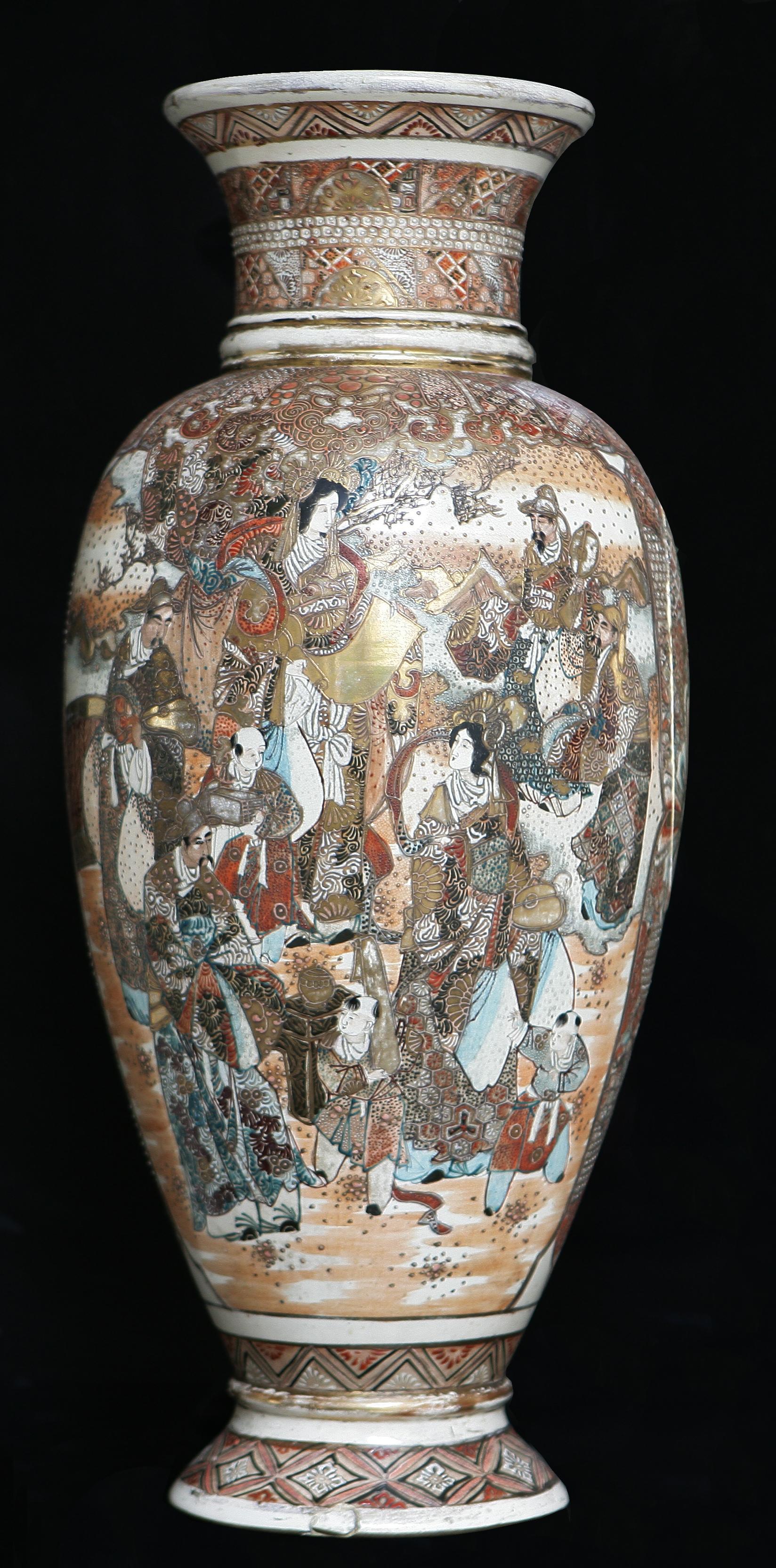 MANIFATTURA GIAPPONESE DEL XIX SECOLO Vaso giapponese, Satsuma, del XIX secolo decorato con scene di paesaggio e personaggi. Ceramica. Cm 65x28. -presenti rotture -presenti rotture