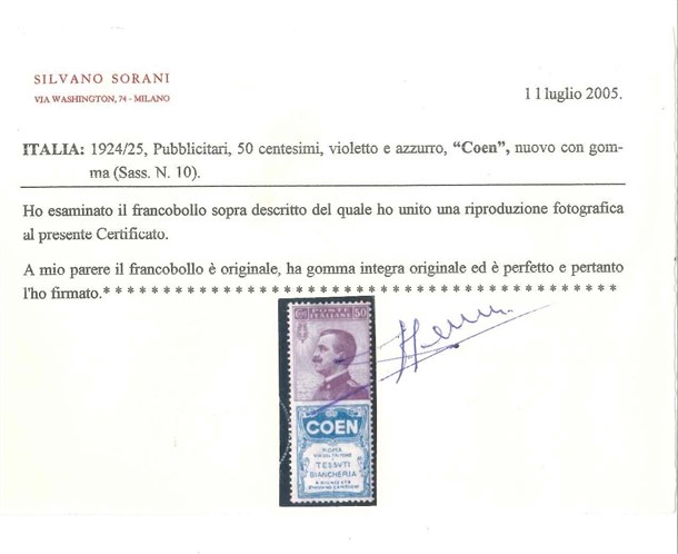 REGNO D'ITALIA 1924 Pubblicitari. 50c. "Coen" Provenienza Collezione "Nimue"