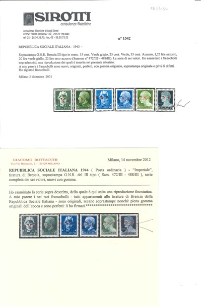 Lotto 364 | R.S.I. 1943 Tiratura di Brescia "Imperiale". Serie completa di 6 valori con sop