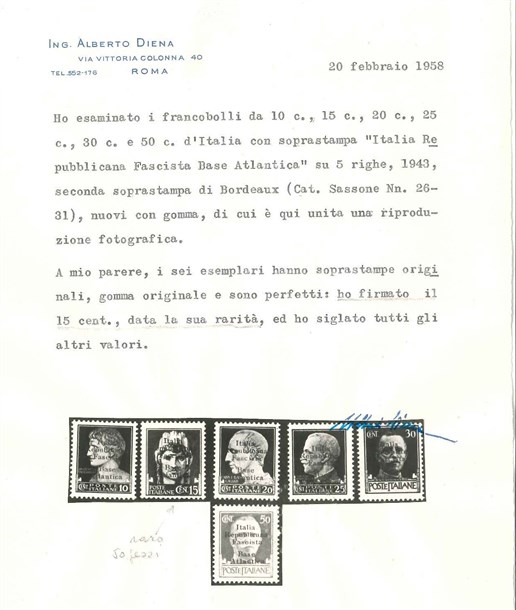 Serie completa di 6 valori con seconda soprastampa di Bordeaux "Italia / Repubblicana / Fascista / Base Atlantica"