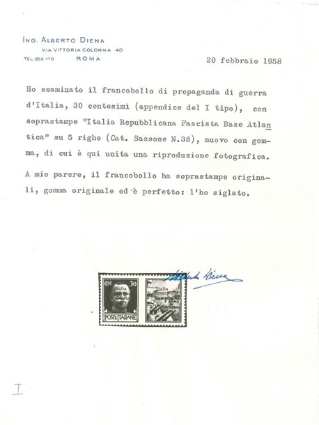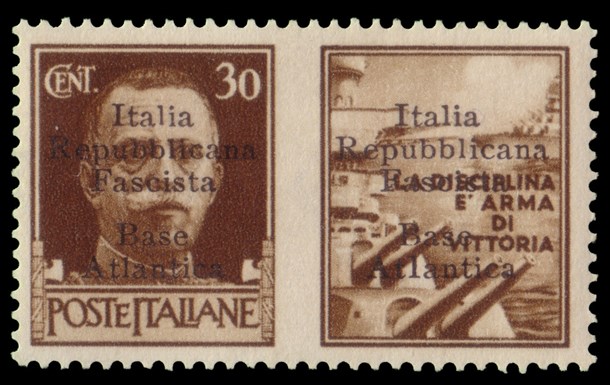 Propaganda di guerra. 30c. bruno "Marina" con seconda soprastampa di Bordeaux "Italia / Repubblicana / Fascista / Base Atlantica"
