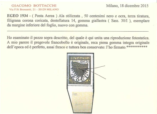 EGEO 1934 Posta aerea. 50c. nero e ocra, terza tiratura D.14, gomma giallastra,