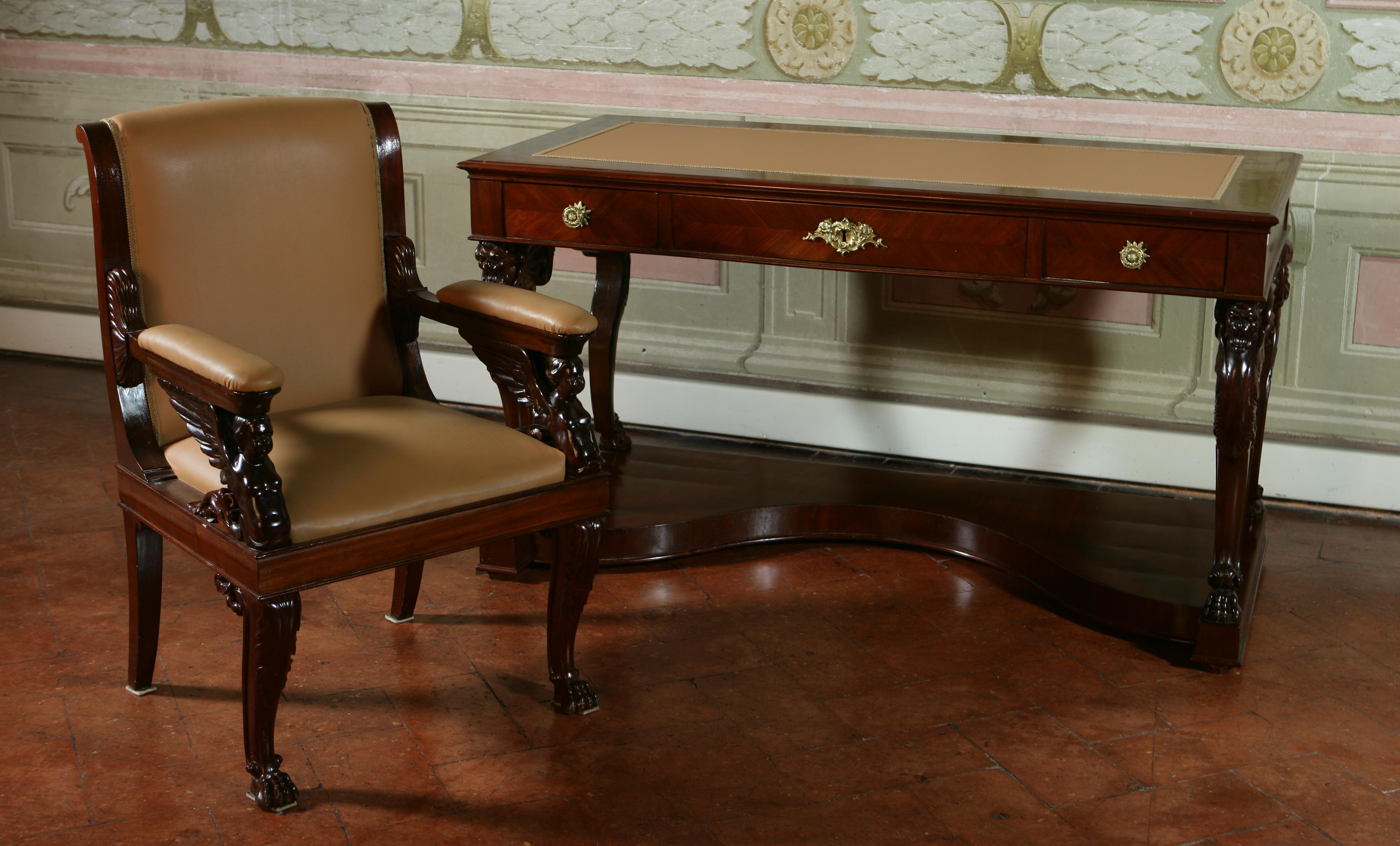 Attribuito a - PETERS ENRICO (attivo a Genova nella prima metà del XIX secolo) Scrivania e poltrona in legno di mogano. Legno di Mogano. Cm 82x145x70. La scrivania è finemente intagliate con figure leonine, la poltrona invece è finemente intagliata con angeli alati