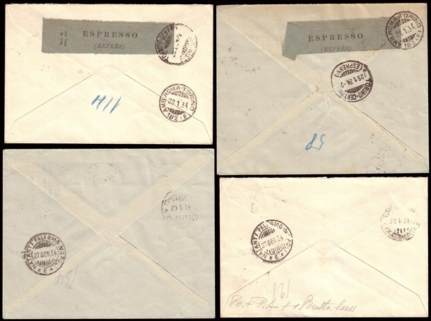 "Decennale della Marcia su Roma". Complete set of 18 values, plus 2 additional from the same set, on 4 covers from Tripoli to Turin
