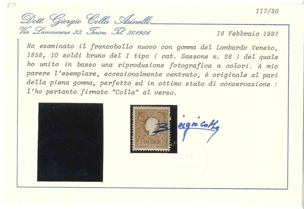 LOMBARDO-VENETO 1858 10s. bruno, I tipo Provenienza Collezione "Nimue" Cert.