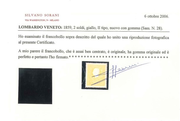Lotto 136 | LOMBARDO-VENETO 1859 2s. giallo, II tipo Provenienza Collezione "Nimue" Cert