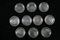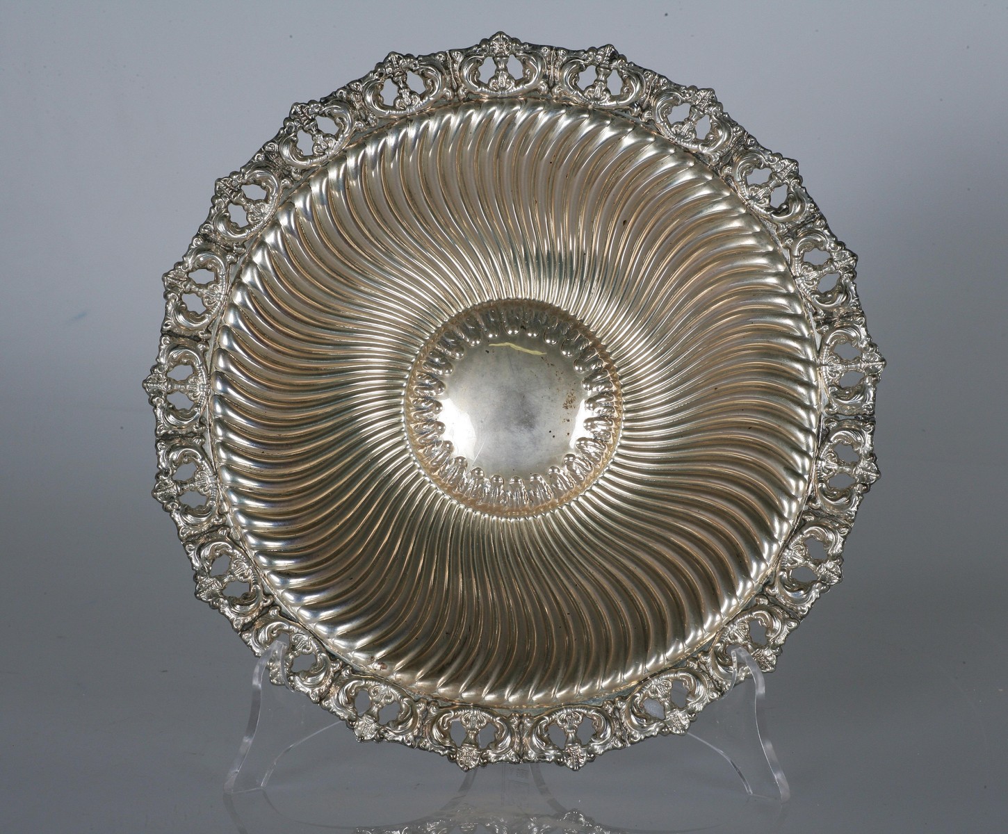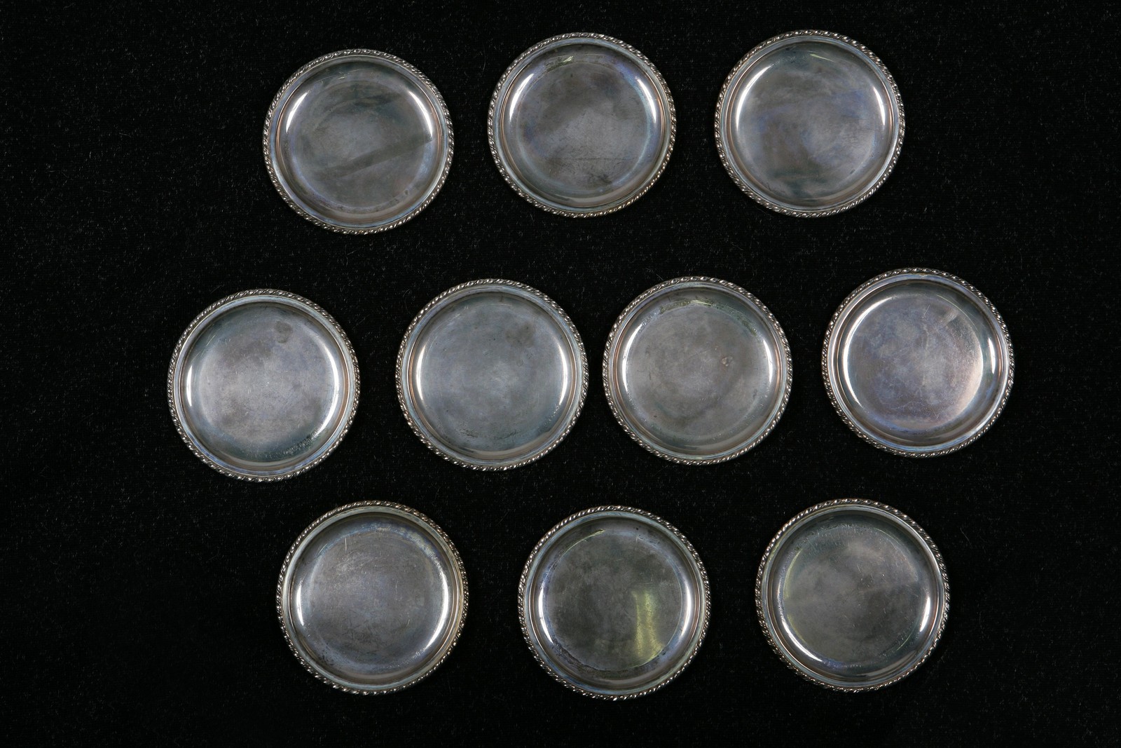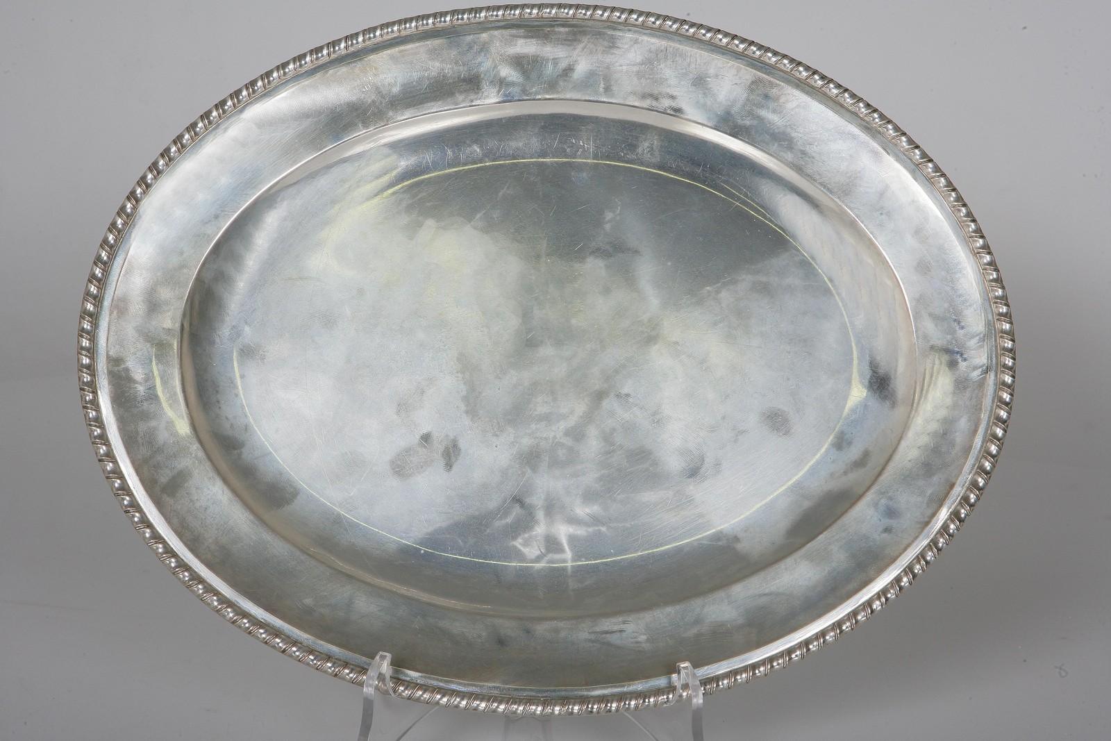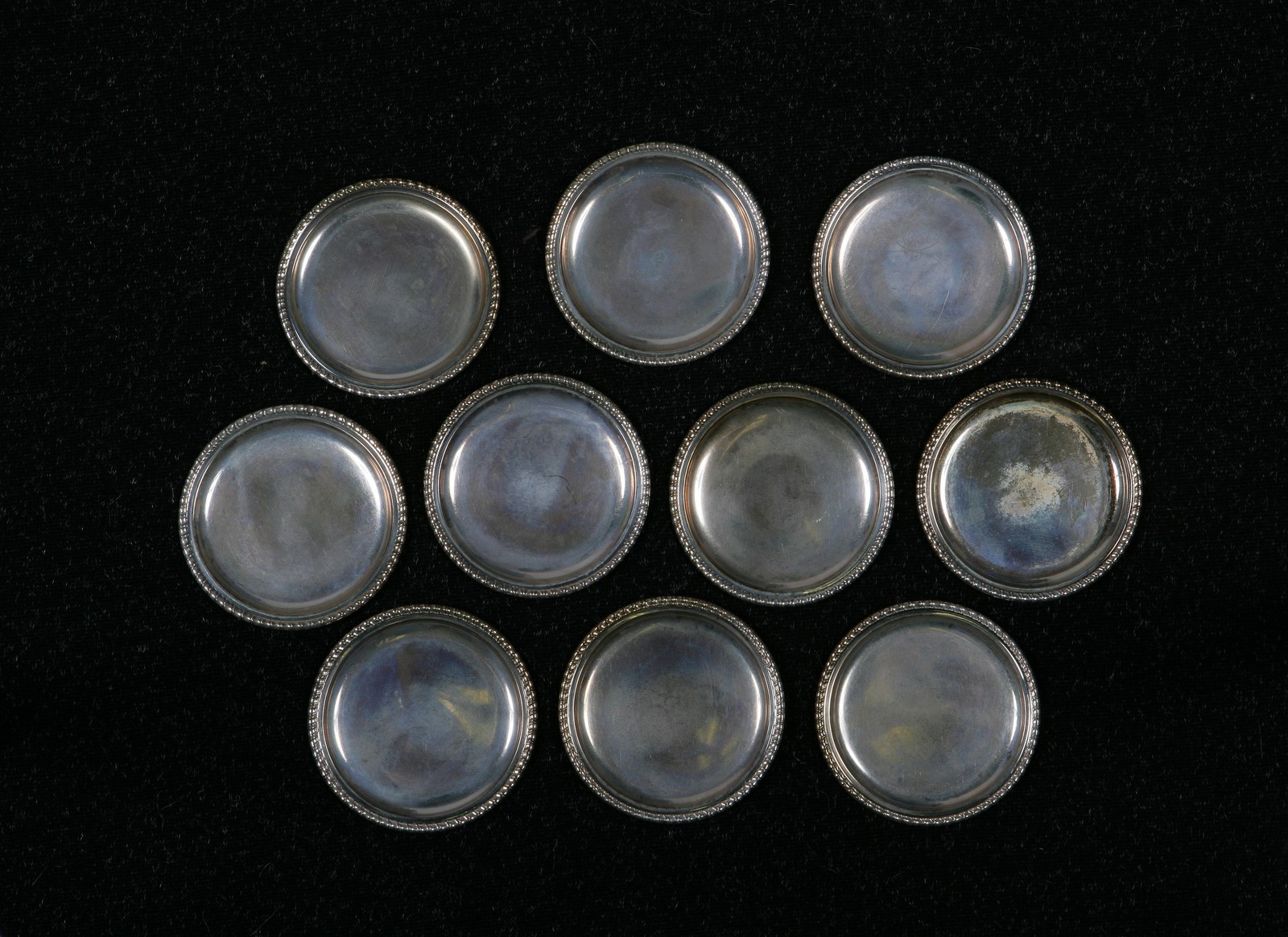 MANIFATTURA DEL XIX SECOLO Gruppo di cinque oggetti in argento e silverplate costituito da: 1 vassoio ovale sbalzato cm 45.50, 860 gr; 1 vassoio ovale in argento cm 36.6; 1 vassoio rettangolare in argento con putti sbalzati, 500 gr; 1 vassoio in argento circolare sorretto da tre gambe, diam cm 25.5, 300 gr; 10 sottobicchieri piccoli, 330 gr; 10sottobicchieri grandi, 820 gr.. Argento e Silver Plate.
