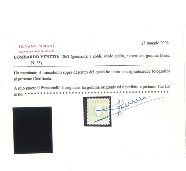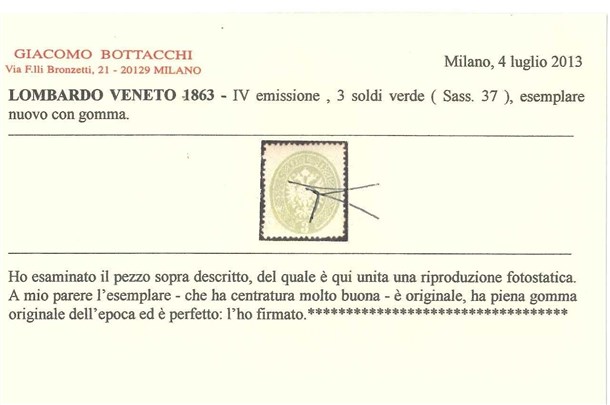 LOMBARDO-VENETO 1863 3s. verde D.14 Provenienza Collezione "Nimue" Cert. G.