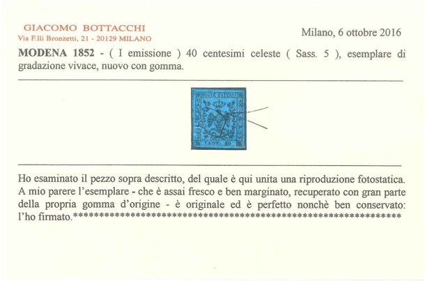 MODENA 1852 40c. celeste, senza punto dopo le cifre Il raro esemplare presenta