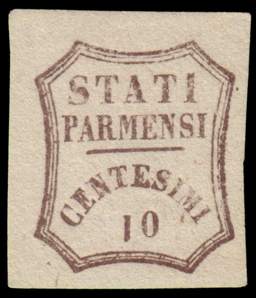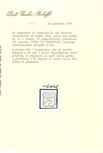 PARMA 1859 Governo Provvisorio. Varietà. 10c. bruno, cifra "1" capovolta pos. 3