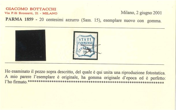 PARMA 1859 Governo Provvisorio. 20c. azzurro Provenienza Collezione "Nimue"