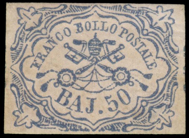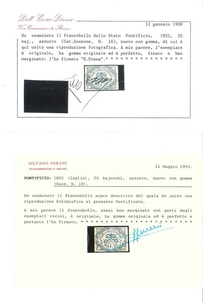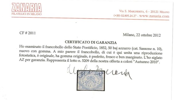 STATO PONTIFICIO 1852 50b. azzurro Provenienza Collezione "Nimue" Cert. En.