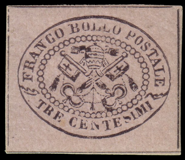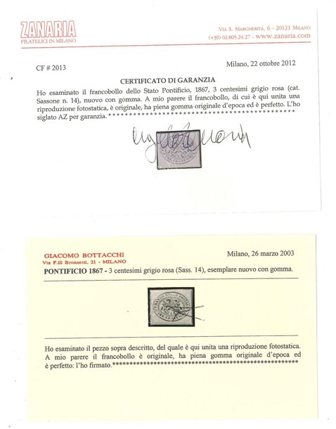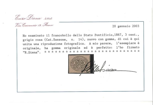 STATO PONTIFICIO 1867 3c. grigio rosa Provenienza Collezione "Nimue" Cert. R