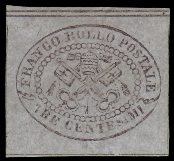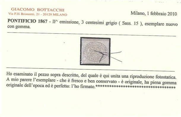 STATO PONTIFICIO 1867 3c. grigio Provenienza Collezione "Nimue" Cert. G. Bot