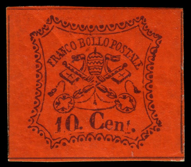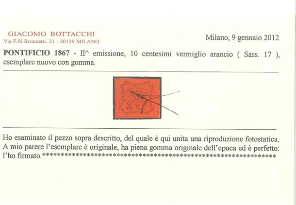 STATO PONTIFICIO 1867 10c. vermiglio arancio Provenienza Collezione "Nimue"