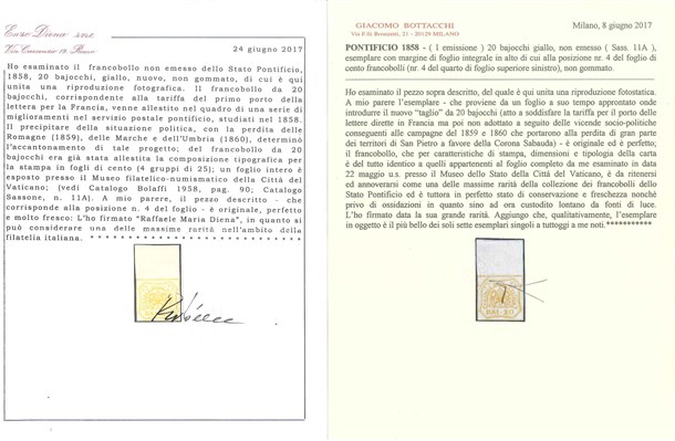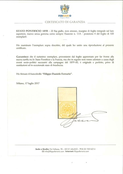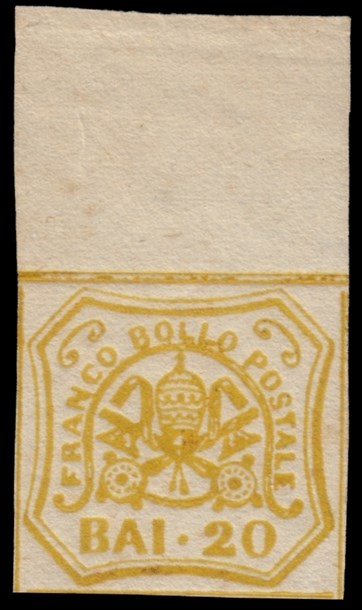 STATO PONTIFICIO 1858 20b. giallo, non emesso, bordo di foglio superiore Il mi
