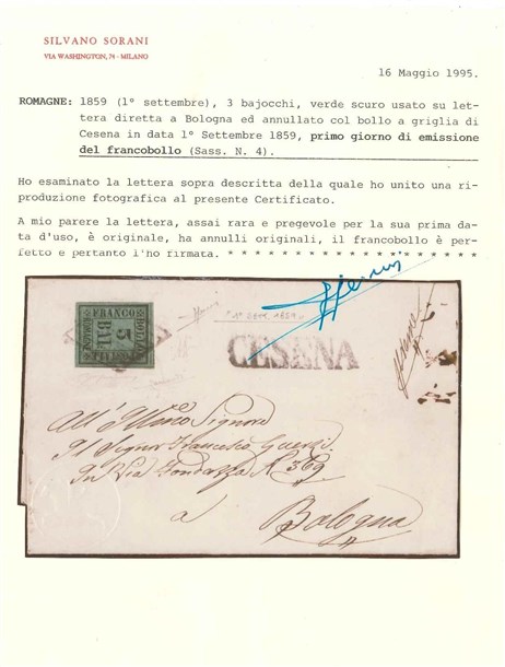 Lettera con testo, da Cesena per Bologna (2.9), affrancata con 3b. verde scuro, spedita il primo giorno di emissione dei francobolli delle Romagne
