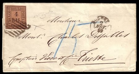 Lettera senza testo, da Bologna per Trieste, affrancata con 4b. fulvo e tassata a destino per 15 soldi.