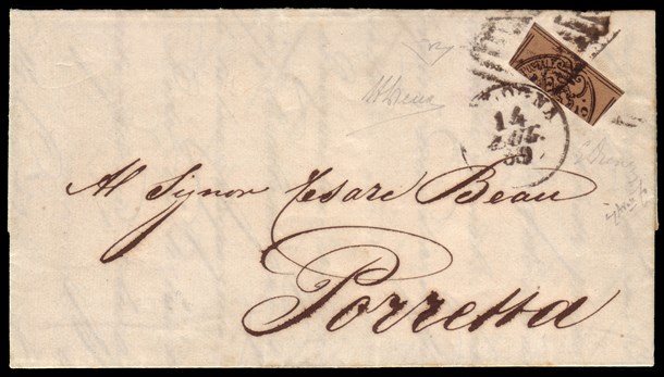 Lettera con testo, da Bologna per Porretta, affrancata per 1b. con un esemplare da 3b. frazionato per ? verticalmente