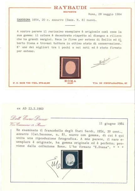 SARDEGNA 1854 20c. azzurro Raro esemplare in ottime condizioni. Provenienza C