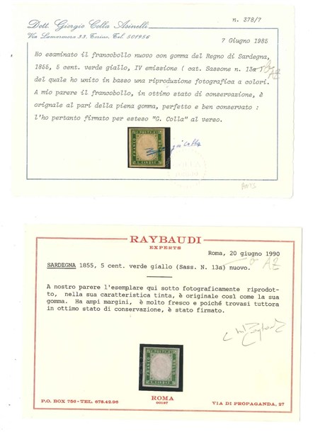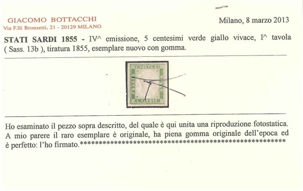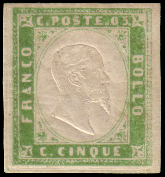 SARDEGNA 1855 5c. verde giallo vivace Provenienza Collezione "Nimue" Cert. G