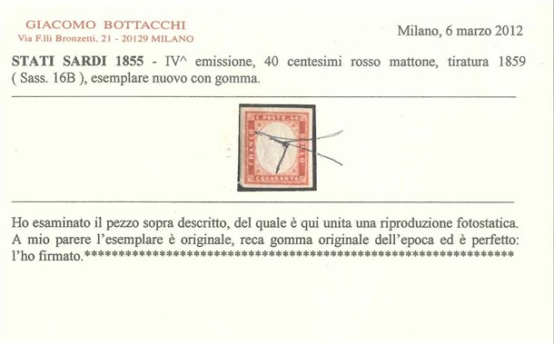 Lotto 237 | SARDEGNA 1859 40c. rosso mattone Provenienza Collezione "Nimue" Cert. G. Bot
