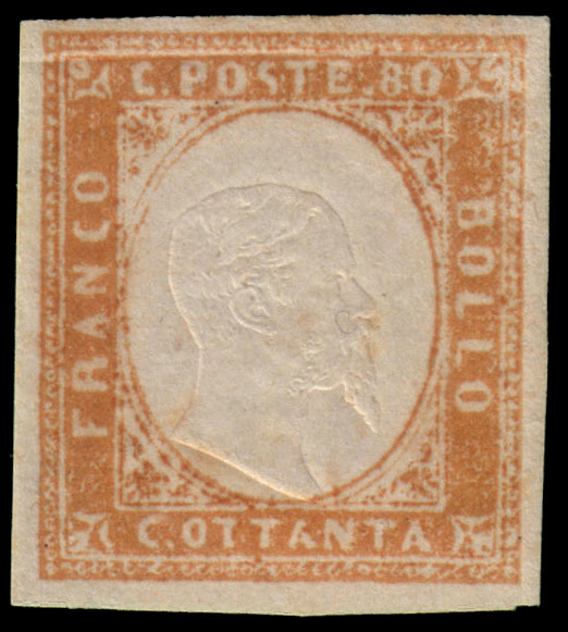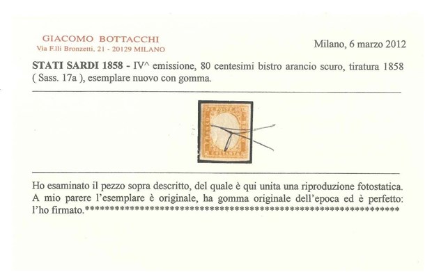 SARDEGNA 1858 80c. bistro arancio scuro Provenienza Collezione "Nimue" Cert.