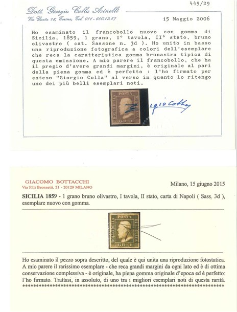 SICILIA 1859 1gr. bruno olivastro, I tavola, II stato, carta di Napoli Rarissi