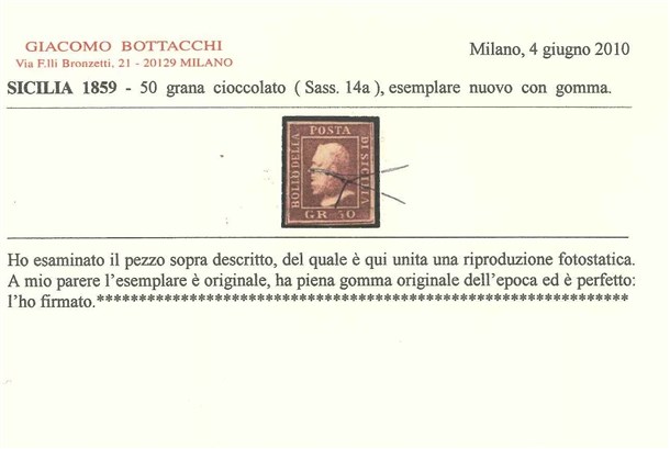 Lotto 246 | SICILIA 1859 50gr. cioccolato Provenienza Collezione "Nimue" Cert. G. Bottac
