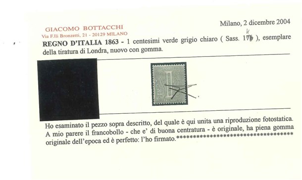 REGNO D'ITALIA 1863/1865 1c. verde grigio chiaro, tiratura di Londra Provenien