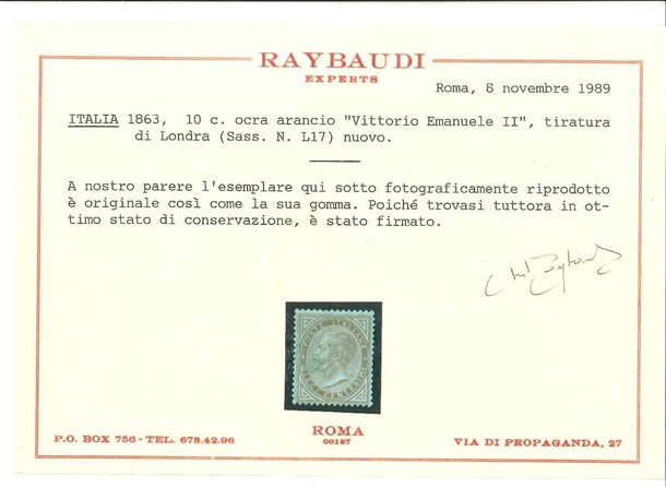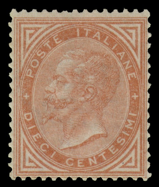 REGNO D'ITALIA 1863/1865 10c. ocra arancio chiaro, tiratura di Londra Provenie