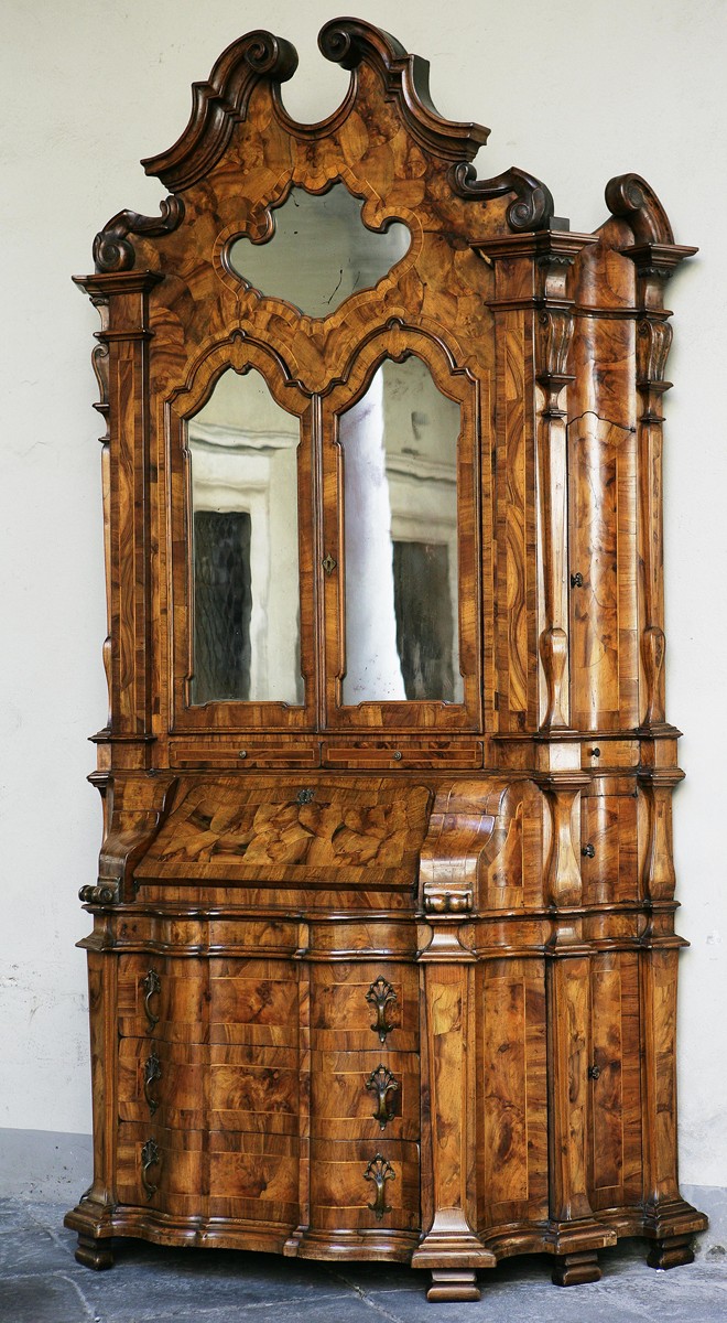 MANIFATTURA ITALIANA DEL XX SECOLO Trumeau radicato e lastronato mosso sul fronte e ai fianchi. Legno. Cm 266x160x70. Opera provvista di certificato di esportazione - Export licence provided.