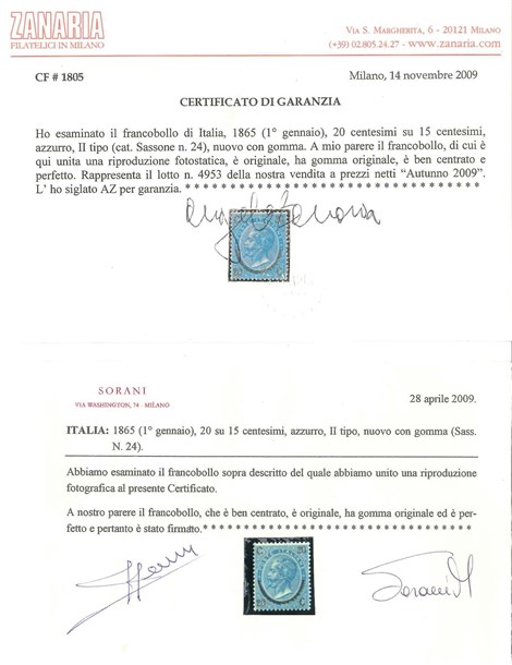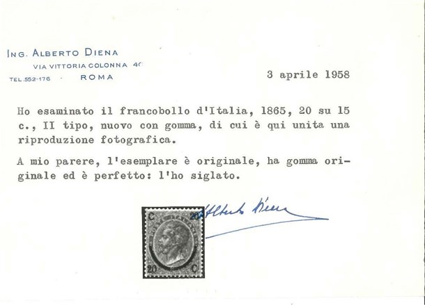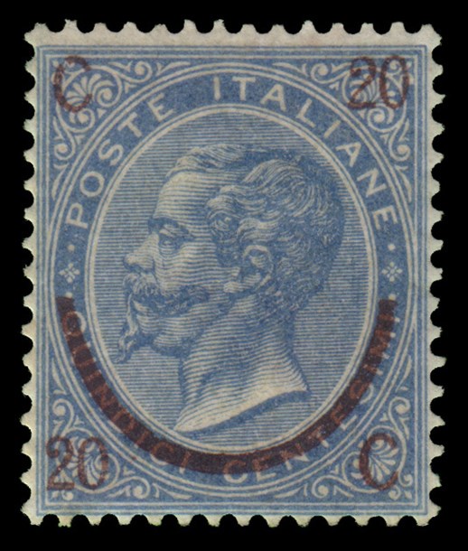 REGNO D'ITALIA 1865 20c./15c. azzurro, II tipo (4 punti bianchi) Provenienza C