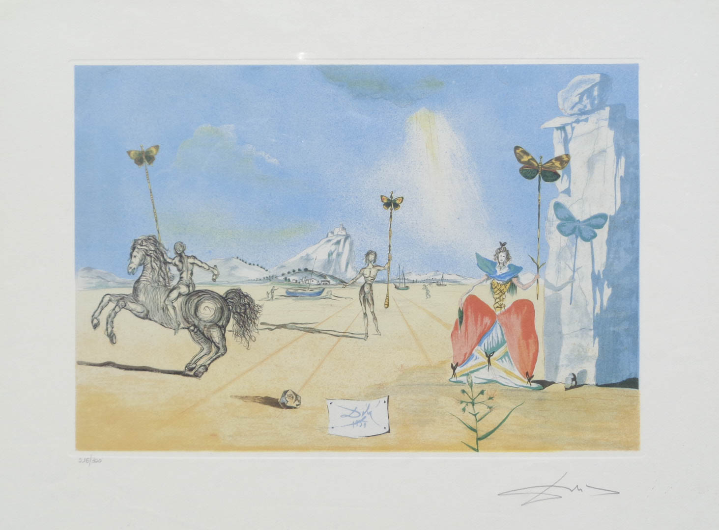Salvador Dalì Landscape with figures holding sceptres, 1951;Litografia a col. 59 x 41 cm.