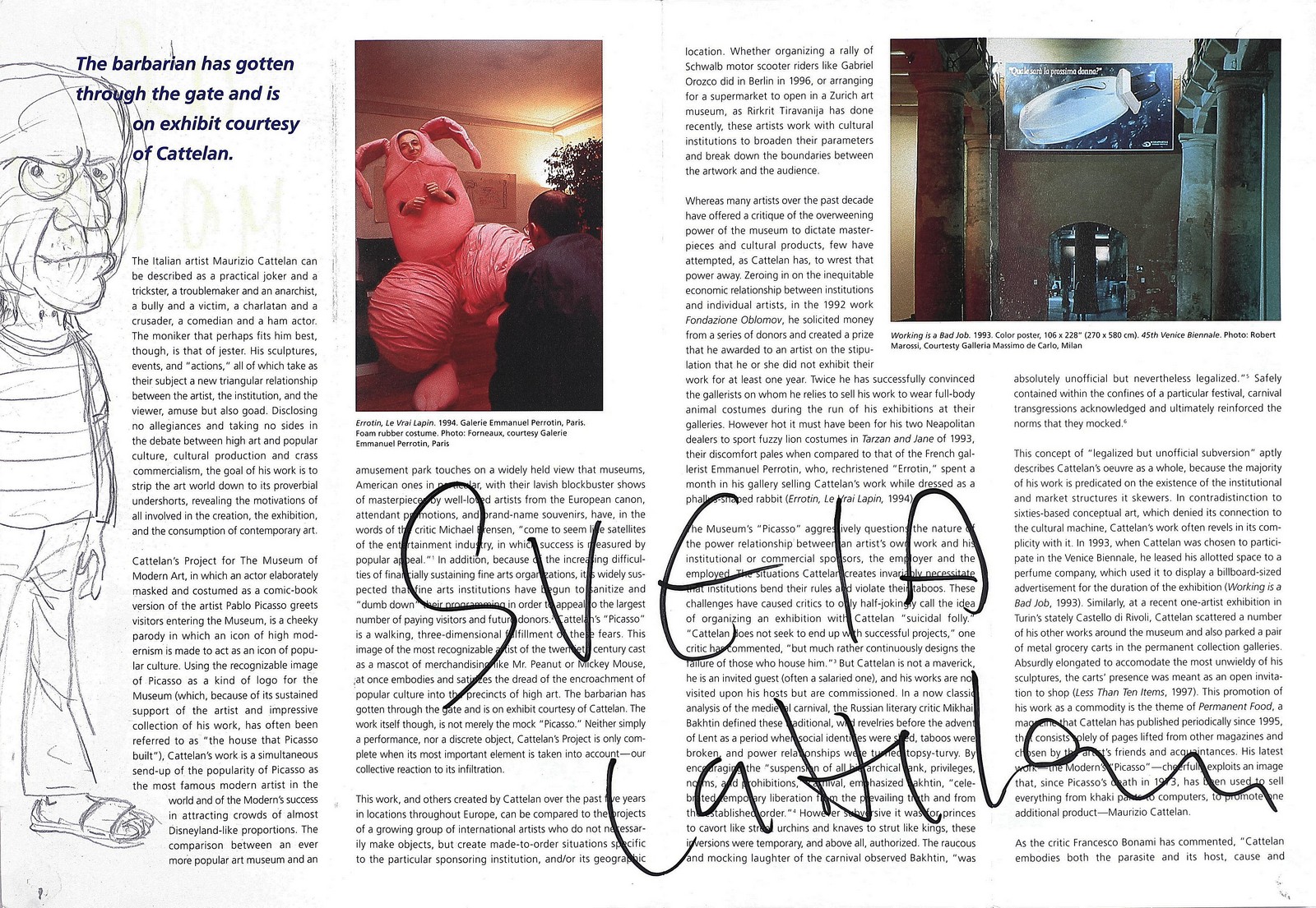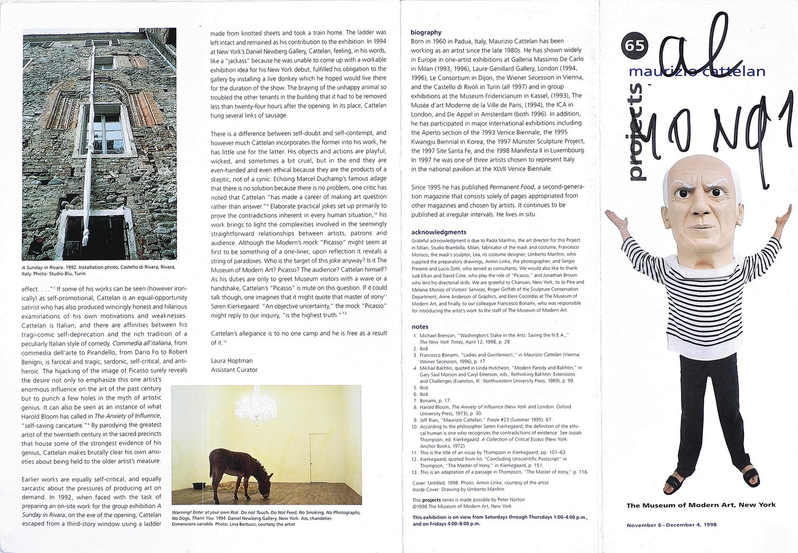CATTELAN MAURIZIO (n. 1960) Senza titolo. Tecnica mista su carta. Cm 10,5x28. Intervento a pennarello su brochure della mostra - Maurizio Cattelan Projects - tenuta presso The Museum of Modern Art, New York dal 6 Novembre al 4 Dicembre, 1998. Provenienza diretta dall'artista come da dichiarazione autografa dell'attuale proprietario. Opera firmata.