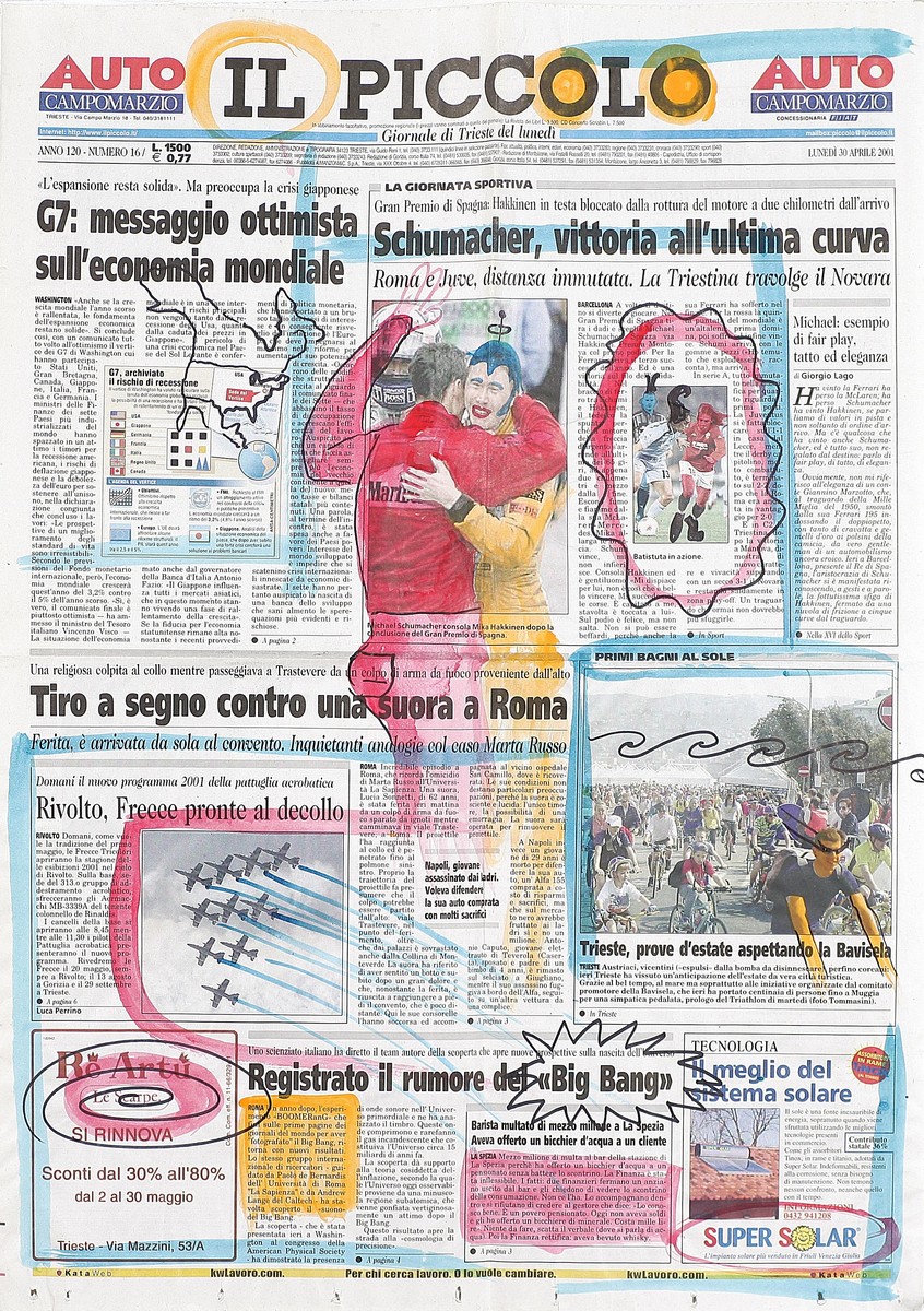 SCHARF KENNY (n. 1958) Senza titolo. Tecnica mista su carta. Cm 52,5x37,5. Intervento ad acquerello e pennarello sulla copertina del quotidiano - Il Piccolo. Provenienza diretta dall'artista come da dichiarazione autografa dell'attuale proprietario. Opera esposta sul pontile del faro di Lignano Sabbiadoro, in occasione della mostra - Pulcherrimae Strade - scoprire arte viaggiando attraverso castelli, piazze, chiese, edifìci storici, cantine e cucine del Friuli Venezia Giulia, dal 23 marzo fino al 30 giugno 2002, con le opere 13 artisti d'arte contemporanea esposte a San Vito al Tagliamento (Marina Abramovic), Trieste (Paolo Delle Monache), Grado (Mike Bidlo), Gorizia (Andres Serrano), Gradisca d'Isonzo (Enzo Cucchi), Venzone (John Baldessari). Manìago (Tom Sachs), Versutta di Casarsa della Delizia (Paul McCarthy), Pordenone, Palmanova, San Daniele del Friuli, Lignano Sabbiadoro (Kenny Scharf), Clauzetto a Pradis di Sono (Jenny Holzer), Udine (John Armleder), Muggia (Louise Bourgeois) e Diiìno-Aiirisina (Lawrence Weiner).