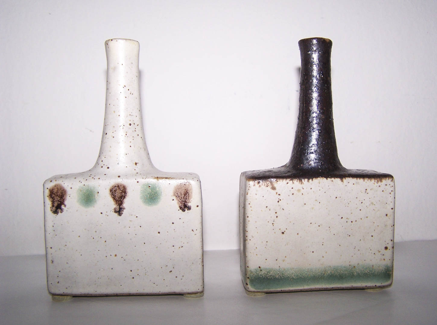 Bruno Gambone Due vasi;in gres smaltato a motivi astratti con alto collo troncoconico, in ottime condizioni
