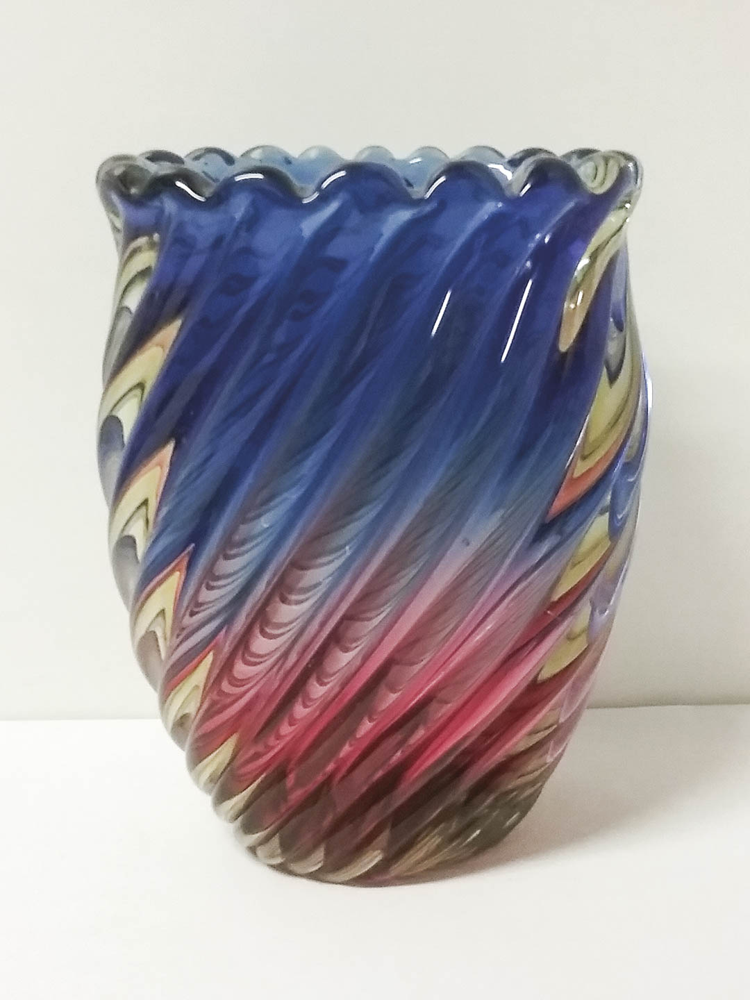 Archimede Seguso (Murano 1909 – 1999) Vaso, Anni ‘40;in vetro soffiato a costolature ritorte blu rosa giallo, h. 18,5 cm, in perfette condizioni